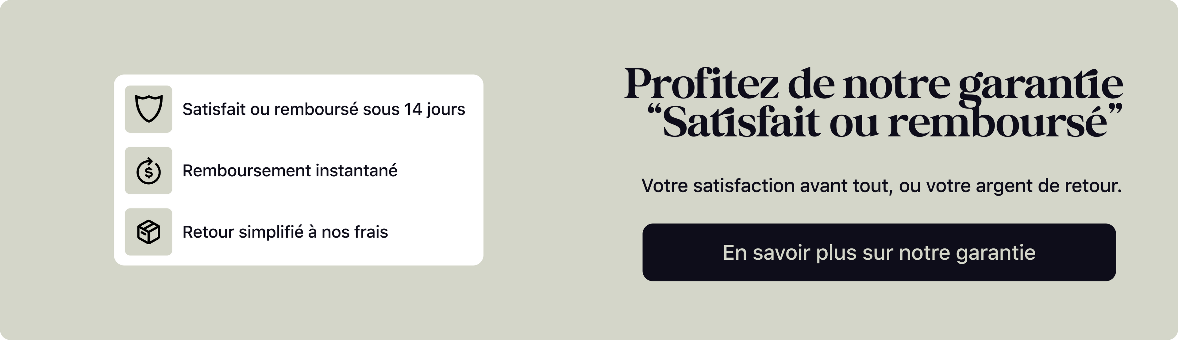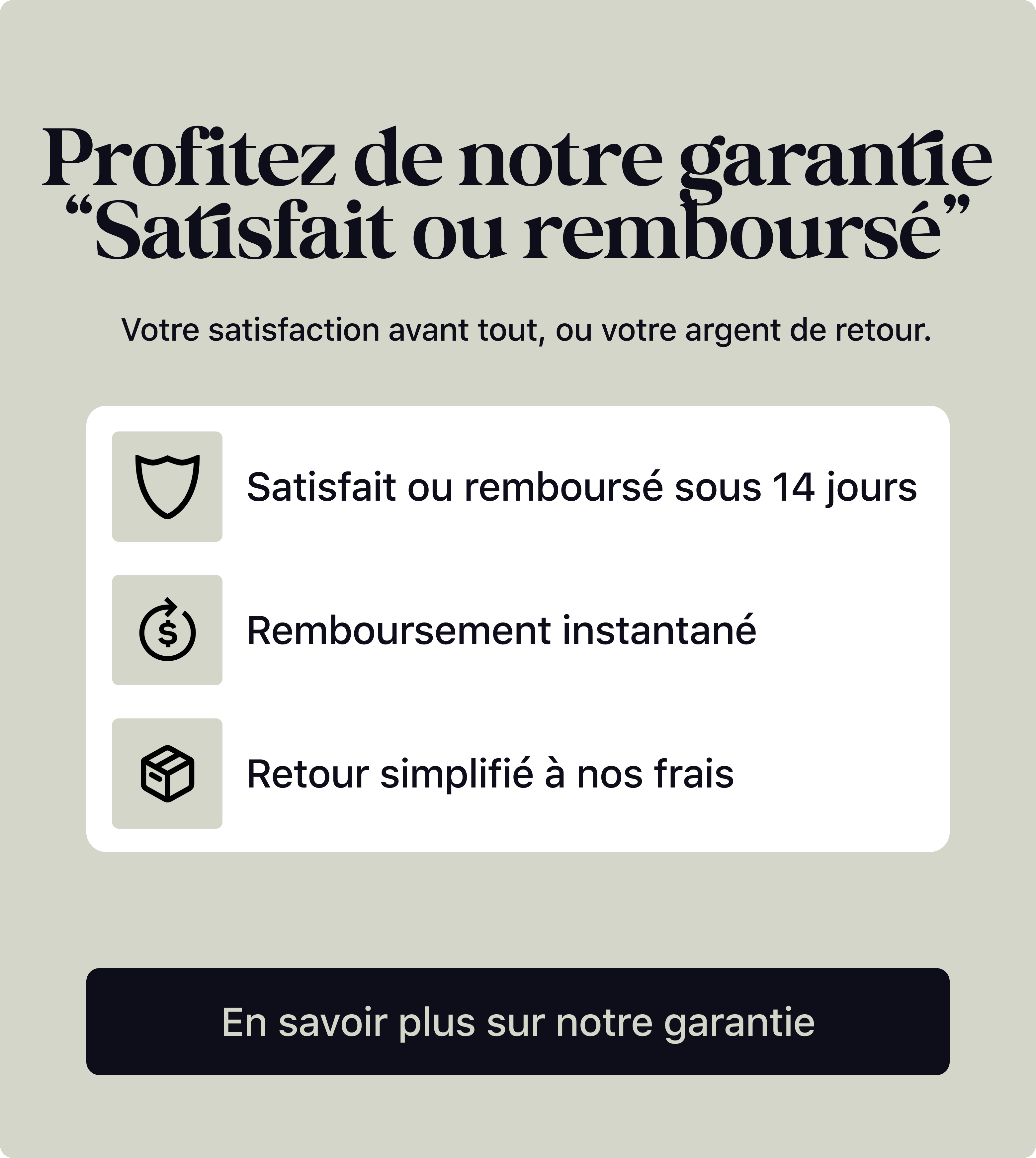 Vous avez 30 jours pour changer d’avis. Si le produit ne vous convient pas, vous pouvez le retourner, sans justification. Dès qu’on le reçoit, vous êtes intégralement remboursé. Simple, rapide, sans stress.